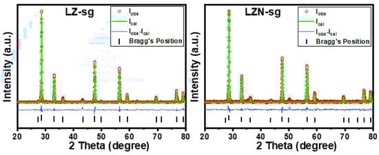 In addition to the XRD patterns of the samples prepared by sol-gel, we performed Rietveld refinements with the help of HSP software. Typical Rietveld refinements are shown in Figure 5 for the samples of the LZ-sg and the LZN-sg. The patterns were refined using the Fd3m space group. The observed and calculated intensities are symbolized as open circles and solid lines, respectively. The bottom line represents the difference between the observed and calculated intensities. The allowed Braggs positions for the Fd3m space group are marked as vertical lines. The fractional positions of the oxygen atom (x = y = z) were taken as free parameters, and the other atomic fractional positions were taken as constants. Parameters such as the lattice constants, isothermal parameters, occupancies, scale factors, and shape parameters were taken as free parameters. The background was refined by using the polynomial method. The obtained experimental hkl planes in the XRD patterns are in good agreement with the Bragg 2θ values. The refined XRD patterns show very slight, or no, deviation between the observed and calculated patterns. The diffuse scattering in the diffraction pattern becomes less significant at the nanoscale and this confirms the dominancy of Bragg scattering. The Rp, Rwp, Rexp, and χ2 are listed in Table 1. When these parameters reach their minimum value, the best fit to the experimental diffraction data is achieved, and the crystal structure is regarded as satisfactory [32,33,34,35]. The Rp and Rwp factors were found to be very close to the Rexp values. This could be due to the low signal-to-noise ratios of the XRD patterns for nanocrystalline materials. Moreover, we observed a low value of χ2 (goodness of fit), which justifies the goodness of refinement. Other parameters, such as the atomic position, site, and occupancy are tabulated in Table 2.