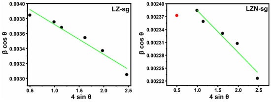 where 4ε sinθ is the strain effect on the crystallites. Typical Williamson–Hall plots are displayed in Figure 6 for the LZ-sg and LZN-sg samples.