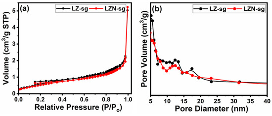 Figure 8 points out the data of the N2 adsorption–desorption characterization, as well as the pore size distribution for the samples. The results from the porosity measurements are summarized in Table 3. The resultant adsorption–desorption characteristics of both samples displayed very similar-type isotherms. The results reveal a kind of type-IV isotherm with H3-type hysteresis at a high-pressure region [43]. It is observable that, compared with the LZN-sg sample, the LZ-sg sample possesses a high BET surface area. However, the pore volume and pore diameter of the LNZ-sg are higher than those of the LZ-sg, which could help to provide a more active site, which can be favorable and advantageous for catalytic applications [6].
