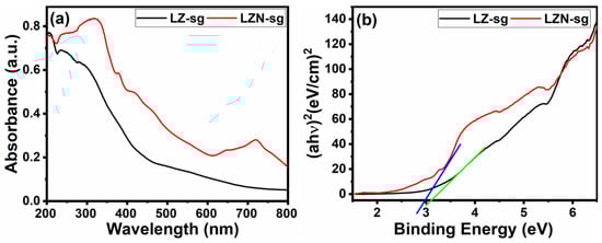 (a) UV–Vis spectra; and (b) band gap energy of LZ-sg (Green line) and LZN-sg (Blue line) pyrochlores.
