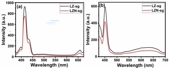Photoluminescence emission spectra of LZ-sg and LZN-sg at two excitation wavelengths: (a) 350 nm, and (b) 400 nm, respectively.