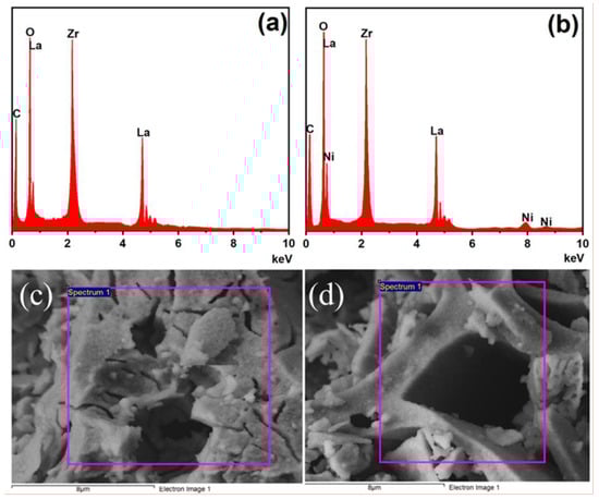 Figure 11 shows the EDS spectra and the corresponding local captured areas of the LZ-sg and LZN-sg samples. Figure 11a reveals that the LZ-sg consists of La, Zr, and O elements, whereas Figure 11b shows that the LZN-sg consists of Ni along with La, Zr, and O elements. These results further confirm the purity and the successful formation of pyrochlores. The presence of C comes from adsorbed organic species. Table 5 displays the atomic and weight ratios of both samples, which are close to the theoretical stoichiometric proportions of the respective samples.