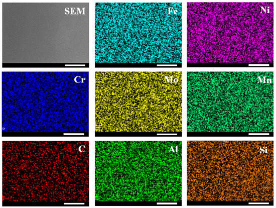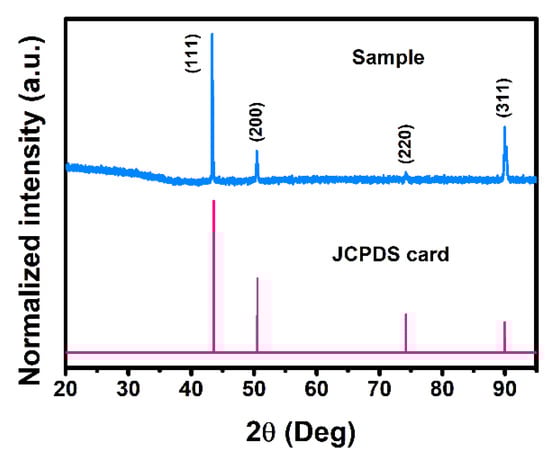 The crystal structure of the alloy sample was investigated by XRD measurements. As shown in Figure 1, the alloy crystallized into a face-centered cubic (FCC) structure. The diffraction peaks could be assigned to (111), (200), (220) and (311) planes of austenite, respectively, as confirmed by its corresponding Joint Committee on Powder Diffraction Standards (JCPDS) card.
