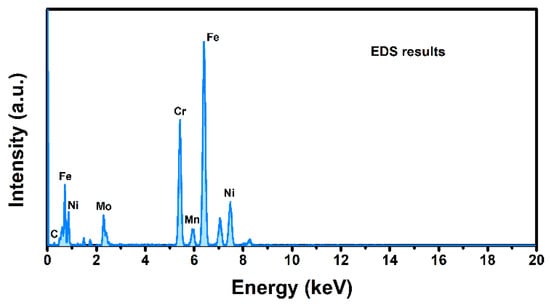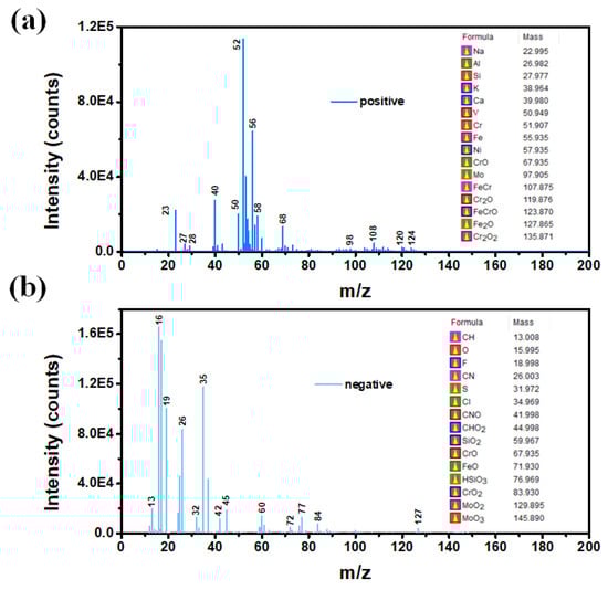 The sample surface was etched before ToF-SIMS measurements to remove any oxide/contaminant at the sample surface. Since the probing depth of ToF-SIMS is only within 2 nm, the existence of oxides and contaminants may affect the results. Both positive and negative ions were collected, and the mass spectrum was presented in Figure 2. To calibrate the ToF-SIMS spectra, m/z peaks at 15.0235 (CH3), 27.0235 (C2H3) and 41.0391 (C3H5) were used for the calibration of positive ions spectra, while m/z peaks at 13.0078 (CH), 17.0027 (OH) and 25.0078 (C2H) were selected for the calibration of negative ions spectra. In general, the spectra of both positive ions and negative ions should be measured to acquire complete/full compositional information. From the negative spectral data of the sample, elements including F/N/Cl/S and oxides such as Cr-O/Fe-O/Mo-O were detected, while for positive spectral data, Fe/Ni/Cr, etc., were probed. The spectrum collected from positive ions shows more information about metallic elements, while non-metallic elements were observed from the negative ion mass spectrum. The alloy mainly contained metallic elements including iron (Fe), nickel (Ni), chromium (Cr), molybdenum (Mo), sodium (Na) and calcium (Ca), as well as fluorine (F) and chlorine (Cl) as non-metallic elements. Moreover, the compound information may also be revealed, which is another advantage of ToF-SIMS. As can be observed, chemical compounds such as CrO, FeO and HSiO3 were also formed at the surface of the sample. The formation of oxides could be attributed to the adsorption of carbon and oxygen atoms on the sample surface when it was placed in air. It should be mentioned here that the intensity of each ion in the spectra can reveal their contents qualitatively.