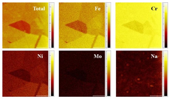 To acquire the surface composition distribution, the 2D mapping images of the sample were further analyzed. To investigate the distribution of each ion, individual color scale bars were employed for both positive and negative modes. Figure 3 illustrates the mapping results collected from positive ions, where grains with different colors could be observed. This color difference might be originated from the variation of surface components, as reported by previous literature [19,23]. In this work, a brighter color of same ion indicates a higher content of the component. In addition, impurities such as Na was found to be concentrated at certain spots, while other components (Fe, Cr, Ni, Mo) were uniformly distributed in the grain. Such distribution difference may vary their properties, which need to be investigated in future.