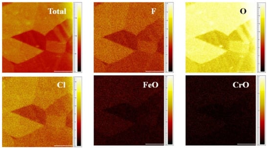 ToF-SIMS negative ion maps of the sample were also presented (Figure 4) to reveal more component distribution information. As can be observed, negative ion components (F, O, Cl) exhibited high ion intensity (bright color), while positive ion such as Fe was barely detected when employing negative ion collectors. To investigate the component variation of grains with different colors, ROI measurements were conducted and discussed in the next section.