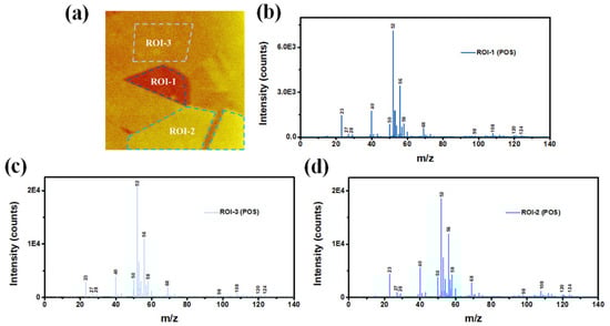 (a) Three ROIs of ToF-SIMS positive ion map, and (b–d) their corresponding mass spectra.