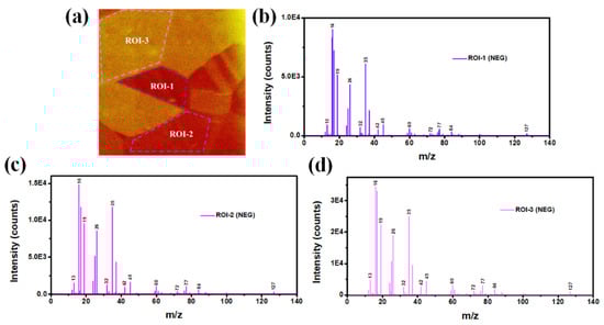 (a) Three ROIs of ToF-SIMS negative ion map, and (b–d) their corresponding mass spectra.