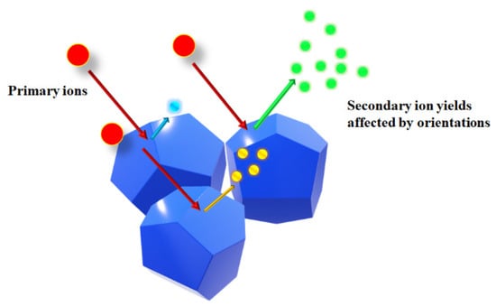 where is the intensity of primary ion, Y is the ion sputter yield, is the ionization probability, is the transmission efficiency of the detection system, and refer to the species isotopic abundance and its fractional concentration in the material, respectively. During the measurements, and should remain unchanged since the experimental conditions were not altered. Previous literature [23,30] suggested that the sputtering yield and ionization probability could be affected by the matrix, i.e., different matrixes may lead to various secondary ion intensities even though they possess the same composition. As mentioned earlier, topographical effects of 2D images could be excluded, as confirmed by SEM and AFM results. Meanwhile, ROI and EDS results indicated that there is no compositional difference, which indicated the same and . In addition, normalized data of Fe and Ni were also analyzed to exclude topographic effects. Similar mapping results were obtained. We thus hypothesized that such a difference of 2D imaging and EDS results might be ascribed to various crystal orientations of the polycrystalline sample, which would affect bonding strengths and the arrangement of surface atoms, resulting in different secondary ion intensities. Figure 9 schematically illustrate such process. Future investigation on its specific mechanism needs to be conducted.
