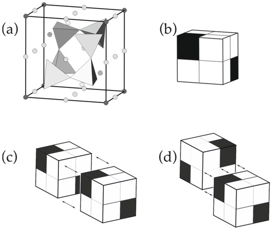 The pseudo-cubic module in the lovozerite-type structures (a); the schematic representation of SiO4 tetrahedra is shown in polyhedral mode, whereas all other atoms are shown as spheres (b); white cubes are occupied by SiO4 tetrahedra, whereas black cubes are vacant, and the two possible models of modular linkages through a whole face (c) and a half-face (d). Modified after [70].