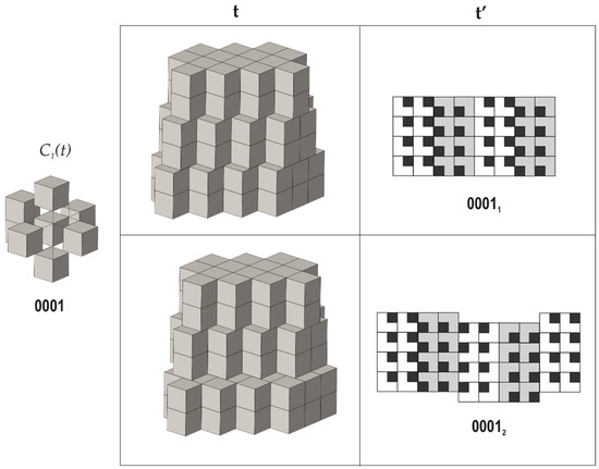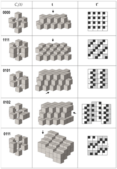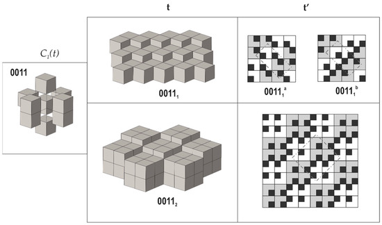 4. Taking the requirement that all modules are symmetrically equivalent (as derived from the empirical observations), there are only seven possible next-neighbor arrangements of cubes around a central cube that fulfill the properties 2 and 3 mentioned above (we do not delve deep into technical details here, since they are provided in [70]). From them, one arrangement allows for three possible tilings each, whereas another one allows for two possible arrangements; therefore, the total number of possible tilings is equal to ten (Figure 3, Figure 4 and Figure 5). Each tiling has its symbolic notation indicated in Figure 3, Figure 4 and Figure 5 (see [70] for more details). Formally speaking, the tiling 00112 has two symmetrically independent modules; therefore, the strict number of tilings that fulfill criterion 4 is nine.