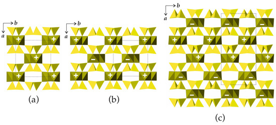 In the crystal structures of biopyriboles, two silicate chains are linked to one central chain consisting of edge-sharing octahedra (Figure 6d). The resulting one-dimensional unit is identified as an I-beam [5]. For each value of M observed in nature, there are two possible basic structure types, namely, monoclinic and triclinic. In monoclinic structure types, all I-beams have the same orientation. In the structure types with orthorhombic symmetry, the I-beams are parallel, but their orientations alternate. Three basic types of biopyribole structure topologies are shown in Figure 7. In terms of the I-beam directions, the monoclinic topology (Figure 7a) can be described as …+ + + +… or (+), since all I-beams have the same orientation (‘+’ or ‘−’). There are two orthorhombic topologies, …+ − + − + −… or (+ −) and … + + − − + + − −… or (+ + − −), as shown in Figure 7b and Figure 7c, respectively.