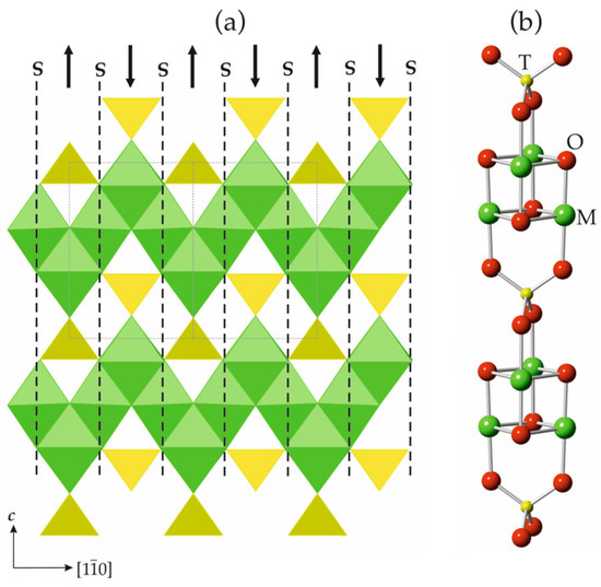 The general formula of spinelloid structures is M2TO4, where M and T are cations in octahedral and tetrahedral coordinations, respectively. The ideal crystal structure of spinel, namely, M2TO4, is based upon cubic close packing of O atoms with M and T in octahedral and tetrahedral interstices, respectively. Figure 8a shows the crystal structure of spinel projected along [110]. It can be considered as being built up with spinel modules, as shown in Figure 8b (in Figure 8a, the borders of the modules are indicated by dashed lines). In ideal spinel, the modules with ‘up’ (↑) and ‘down’ (↓) orientations alternate. The border between two modules with opposite orientations is identified as S, whereas the border between two modules with the same orientation (↑↑ or ↓↓) is identified as T. In fact, the T-plane can be considered as a local chemical twinning plane. Figure 9 shows the crystal structure of ‘wadsleyite-II’ (Mg2SiO4) that has the sequence of modules ... ↓(↑↑↓↑↑↓↓↑↓↓)↑…, where square brackets indicate the unit cell content along the direction of module stacking. Thus, the sequence of borders (or Hyde symbol) is [TSSTSTSSTS] or [TS2TS]2. The number of spinel modules in between the two T planes is given as n or m. These numbers correspond to the widths of the spinel-like blocks (inside which only S-borders are allowed) along the direction of the module stacking. For instance, in ‘wadsleyite-II’, the (n, m) numbers are (3, 2, 3, 2) or simply (3, 2). Table 3 provides the full classification of the spinelloid structures that are known today (modified after Hyde et al. [78]), including those that are observed in high-pressure mineral and synthetic phases.