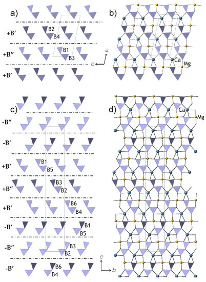 Kurchatovite and clinokurchatovite are two polymorphs of CaMgB2O5 with modular crystal structures based upon two-dimensional blocks [33]. The blocks are built up from diborate B2O5 groups, and Ca2+ and Mg2+ cations in seven- and sixfold coordination, respectively (Figure 10). Detailed analysis of geometrical parameters of the adjacent blocks by Pankova et al. [33] revealed that symmetrically different diborate groups have different degrees of conformation in terms of the δ angles between the planes of two BO3 triangles sharing a common O atom, featuring two discrete sets of the δ values of ca. 55° (B’ blocks) and 34° (B” blocks). The blocks may have two different orientations, ‘+’ and ‘−’, which are related by the 180° rotation along the direction perpendicular to the block’s planes (similarly to those observed in biopyriboles). The stacking of the blocks in clinokurchatovite can be described as …(+B’)(+B”)(+B’)(+B”)… or [(+B’)(+B”)], whereas in kurchatovite, it is more complex and corresponds to the sequence …(+B’)(+B”)(+B’)(−B’)(−B”)(−B’)(+B’)(+B”)(+B’)(−B’)(−B”)(−B’)… or [(+B’)(+B”)(+B’)(−B’)(−B”)(−B’)]. The B’:B” ratios for clinokurchatovite and kurchatovite are 1:1 and 2:1, respectively.
