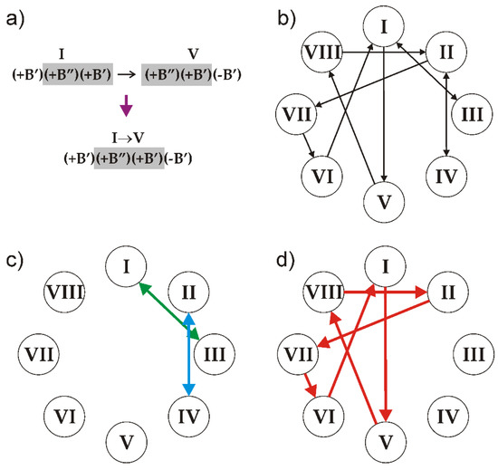 The number of symbolic sequences that may contain these triplets is obviously infinite and the sequences may be both periodic and aperiodic. In order to produce a sequence that satisfies the rules, two triplets should overlap in two symbols: two right symbols of the first (preceding) one and two left symbols of the second (following) one. Thus, all of the triplets can be split into the following ten overlapping pairs (Figure 11a): I–III, II–IV, I–V, II–VII, III–I, IV–II, V–VIII, VI–I, VII–VI and VIII–II.