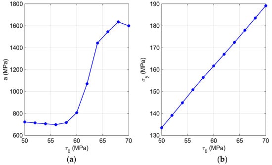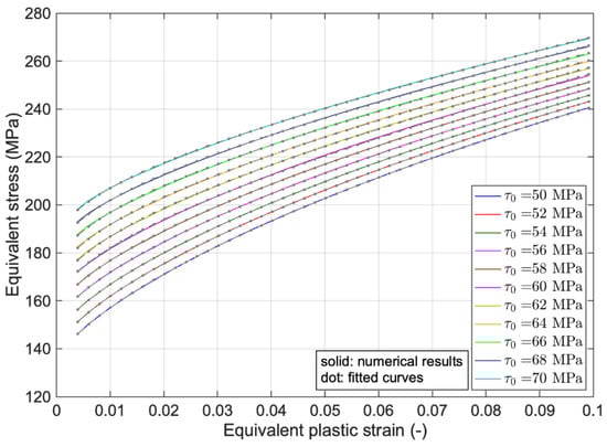 The results of changing the initial critical resolved shear stress, , on the equivalent, stress-equivalent plastic strain curve are shown in Figure 3. Parameter has been varied in the range of 50–70 MPa with steps of 2 MPa. It is evident that, with the increase in , both the initial yield stress and the stresses during the hardening of the material will increase with approximately the same hardening slope. As a whole, changing the parameter will affect the overall response of the material, improve the mechanical capability of the considered material, and shift the overall response to the higher stress level. Furthermore, based on the hardening function and using the fitting procedure, the material’s behavior is identified as largely comparable with the equivalent stress-equivalent plastic strain graphs.