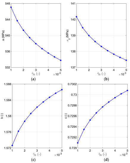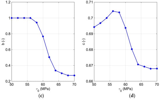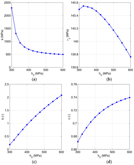Adopting different will cause various trends in the hardening parameters, see Figure 8. With a change in the in the defined range, a reduces at the initial level and remains constant for the larger as represented in Figure 6a. On the other hand, illustrates a different behavior such that a very small increase occurs and then it decreases, mimicking a quadratic function. b and c hardening parameters both go up in quadratic form by increasing (see Figure 8b–d). Among the Voce-type hardening parameters, and c are not changing significantly by various initial hardening rates. These two parameters are mostly affecting the yield limit, as it is verifiable in Figure 7.