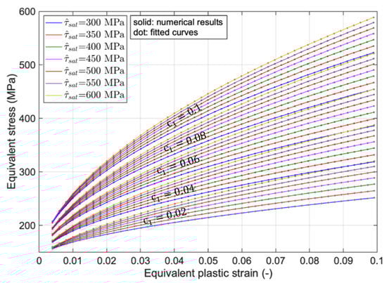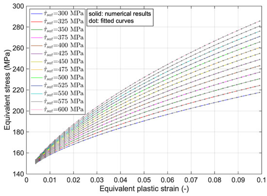 In the following, the results of changing the saturation resolved shear stress, , on the equivalent, stress-equivalent plastic strains are shown. Here, parameter has been changed in the range of 300–600 MPa with steps of 50 MPa, of which the results are visualized in Figure 5. Visibly, with an increase in , stresses during material hardening will increase, and the initial yield stress remains unchanged. In addition, the hardening slope of the equivalent stress-plastic strain curves goes up.