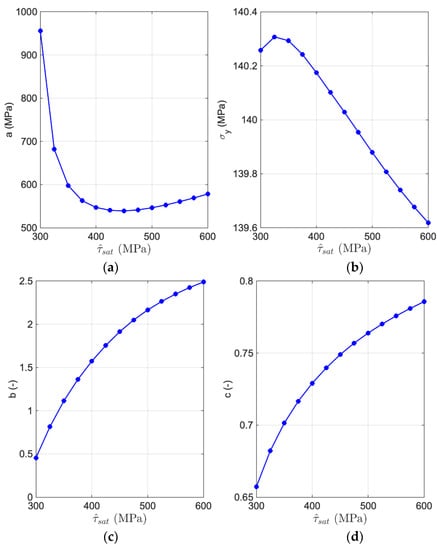 The equivalent stress-equivalent plastic strain curves represented in Figure 5 are fitted well, using the Voce-type hardening law with numerical results based on the crystal plasticity model. The trend of change in the Voce-type hardening law parameters with different saturation resolved shear stresses are visualized in Figure 6, where a and decrease and b and c increase while the trend for the two latter parameters is quadratic in nature. The yield limit, in the Voce-type hardening law is mostly unaffected by a change in the saturation resolved shear stress as also has been represented in Figure 5.
