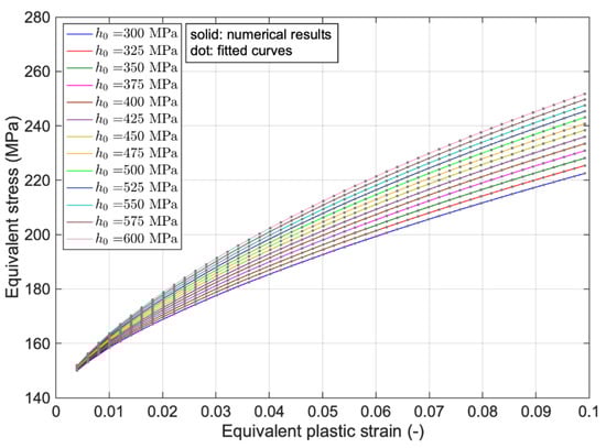 In the following, the results of changing the initial hardening rate, , from 300 to 600 MPa on equivalent stress-equivalent plastic strain curves are depicted in Figure 7. As the results highlight, with an increase in , stresses during the hardening of the material will increase approximately with the same slope, and the initial yield stress remains unchanged. Figure 7 also emphasizes that the proposed hardening function can describe the material response accurately.