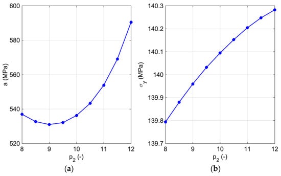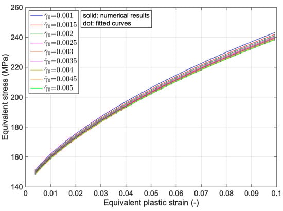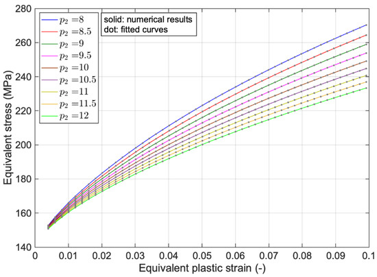 The fitting procedure of the hardening relation defined in Equation (18) is described in a MATLAB environment [40]. The “fit” function has been chosen from MATLAB tools and uses the hardening function as a guess function; then, its parameters are identified by defining a lower and upper bound for parameters and making an initial guess.