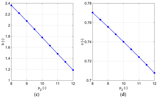 Another crystal plasticity parameter and its influence that was studied is the exponent of strain hardening, . It is changed in the range of 8–12 with steps of 0.5, and the results are shown in Figure 9 together with the fitted behavior using hardening parameters. As increases, stress during hardening of the material decreases, but the initial yield stress remains unchanged, and the hardening slope decreases to some extent. Figure 10 shows the trend of changes in identified hardening parameters with different . With an increase in , a and go up exponentially and like a quadratic function, respectively, but b and diminish linearly. By adopting different values of , in the Voce-type hardening law, a, c and will not vary drastically, as the yield limit was unaffected and the hardening rate did not change significantly compared to the change in other crystal plasticity parameters.