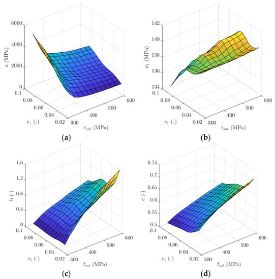 The trend of variation in the identified hardening parameters due to the simultaneous change of both and parameters is visualized in Figure 14. It is seen that higher geometrical factors and lower values of saturating shear stress lead to an increase in the hardening parameter. Therefore, a is very sensitive to a higher contribution of and lower quantities of . On the contrary, variation of the other hardening parameters, , b and c, is mostly affected by lower and higher .