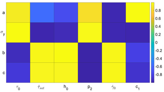 Figure 15 visualizes a heatmap revealing the correlation between the crystal plasticity parameters and the Voce-type hardening parameters. The light yellow and dark blue colors represent the positive and negative linear relation between these parameters. The heatmap highlights that almost all crystal plasticity parameters have a positive/negative linear correlation with the yield limit, . Among all Voce-type hardening parameters, a has the least linear correlation with the crystal plasticity parameters.