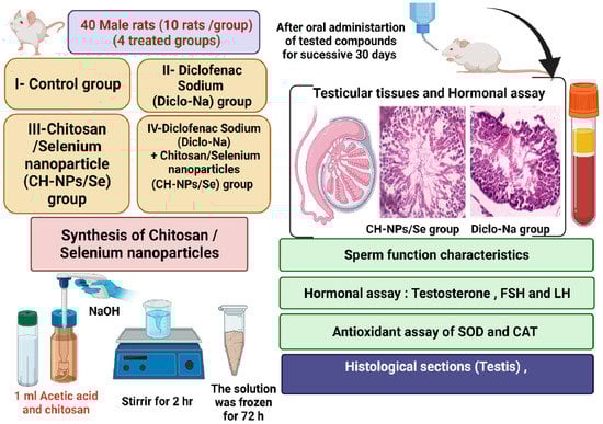 Commercial chemicals were used without purification from Sigma-Aldrich. Chitosan with a low molecular weight (60–190 kDa) and 80–85% degree of deacetylation, and selenium tetrachloride, Se (IV) with a purity ≥ 98%. The percentage of carbon, hydrogen, and nitrogen was measured using Vario EL Fab. CHN. The morphological surface was estimated using a Quanta FEG 250 scanning (SEM) and transmission (TEM) electron microscopes with 20 kV accelerating voltage, and the shapes and sizes of these particles were visualized using JEOL JEM-1200 EX II and JEOL 100s microscopes, respectively. Thermogravimetric analysis of the complexes was performed from room temperature to 800 °C using a TGA/DTA–50H Shimadzu thermal analyzer. The following were purchased from Sigma Chemical Co. (St. Louis, MI, USA): diclofenac sodium and ELISA kits used for the assessment of F.S.H, L.H., and testosterone. All chemicals used for this study were of high analytical grade.