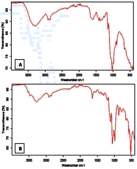 Infrared spectra of: (A) free ligand chitosan and its (B) Se/Chitosan complexity.