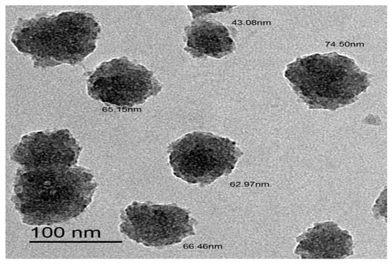 The TEM image for the CH-NPs/Se complex produced from reaction between Se (VI) and chitosan is displayed in Figure 4. After the chelation, the particle sizes were found to be in the range of 50 nm with black spherical spots, which was in agreement with the X-ray powder diffraction data.