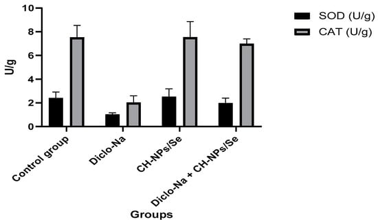 Effect of (CH-NPs/Se) on SOD and CAT activities in the testicular tissue of Diclo-Na-treated rats.