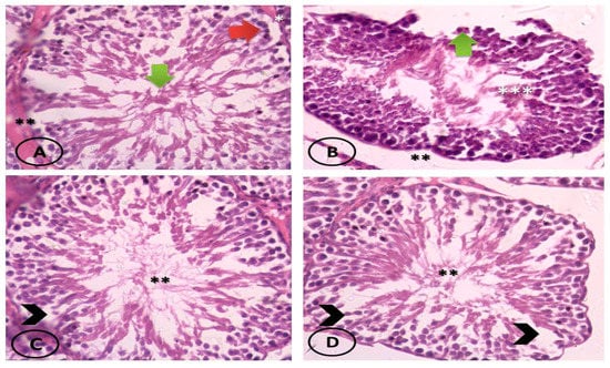 From the point of view of histopathology, in the current study, the absence of essential spermatocytes indicated the impairment of spermatogenesis due to reduced testosterone levels induced by Diclo-Na. Moreover, the authors of [42] mentioned that treatment of male mice with Diclo-Na impaired seminiferous tubules and induced apoptosis in spermatogonia and spermatocytes as well as Sertoli and Leydig cells. These changes may lead to cellular toxicity accompanied by androgen disturbance [43,44].