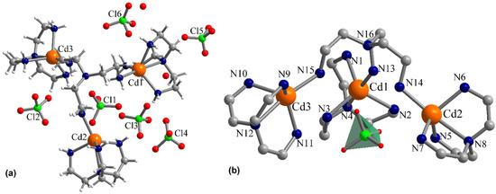 (a) View of the asymmetric unit in crystal 1 and (b) perspective view of the tripodal trinuclear cation [{Cd(tren)}3(tren)]6+ with the perchlorate anion hosted inside (the hydrogen atoms were omitted for clarity).