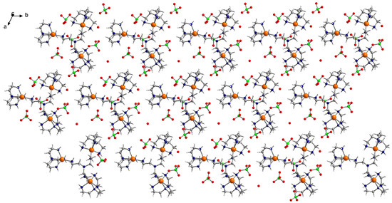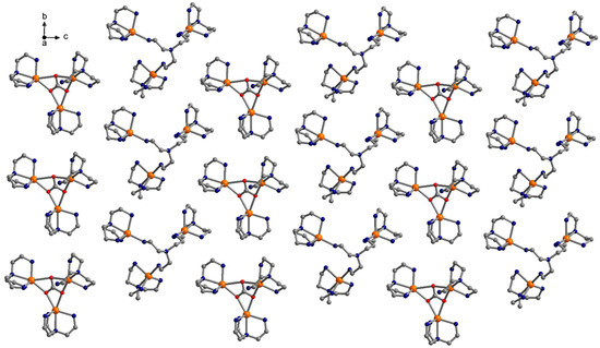The two types of trinuclear cations, [{Cd(tren)}3(tren)]6+ and [{Cd(tren)}3(µ3-CO3)]4+, are also arranged in layers, but in the crystallographic bc plane (Figure 4). In these layers, each type of trinuclear cation forms columns running along the crystallographic b axis with an alternating distribution of the two types of columns within the layer. Similarly to compound 1, the arms of the tripodal cations [{Cd(tren)}3(tren)]6+ are orientated on the same direction within one layer and in opposite directions in the neighboring layers.