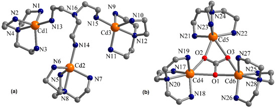 Perspective views of the two cationic complexes of the compound 2, [{Cd(tren)}3(tren)]6+ (a) and [{Cd(tren)}3(µ3−CO3)]4+ (b). The hydrogen atoms were omitted for clarity.