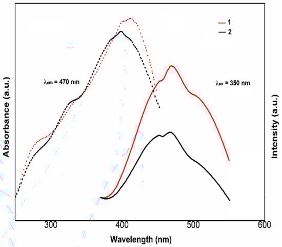 The room temperature photoluminescence of compounds 1 and 2 was explored using excitation wavelengths from the 350–400 nm range. The emission spectra displayed asymmetric bands with maxima at 470 nm for both compounds. The highest intensity of these bands was obtained when λex = 350 nm. Compound 2 also presented a maximum at 450 nm and a “shoulder” at around 500 nm. In the emission spectrum of 1 there are two “shoulders” at 450 and 500 nm. The presence of the “shoulder” at 450 nm in the emission spectrum of 1 may suggest the presence of impurities of compound 2. The compounds were separated mechanically and we cannot exclude the presence of impurities because both compounds are colourless. The corresponding excitation spectra (λem = 470 nm) reveals complex bands within the 250–450 nm domain with maxima at 410 nm for 1 and 400 nm for 2 (Figure 5).