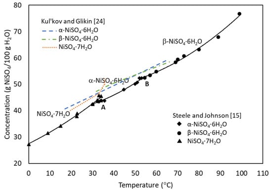 Solubility of nickel sulfate hydrates as a function of temperature, adapted from Refs [,]. Solubility curves in both studies show two eutonic points, A and B, representing the transition points for the thermodynamically most stable phase. Below 31.5–32 °C, the pale green heptahydrate, NiSO4·7H2O (morenosite), is the most stable phase in acid-free solutions and above this temperature nickel sulfate hexahydrate will form in solution. The transition point between the two hexahydrate polymorphs has been observed to be between 53–55 °C [,]. Near eutonic points precipitation of nickel sulfate salts out of their stability regions and reversable phase transformation between phases are probable. Metastable equilibria here were shown to be comparable to thermodynamic equilibria.