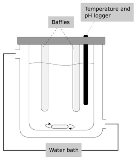 Crystallization experiments were performed using a 100 mL temperature-controlled double-walled batch reactor (Figure 2), as described in detail in our previous work []. Proper mixing was ensured by a magnetic stirrer operating at 600 rpm and two baffles were attached to the lid. Temperature and pH were logged throughout the experiments, using a pH probe connected to a Mettler Toledo SevenExcellence multiparameter module. The temperature of the reactor was controlled by a Julabo refrigerated/heating circulator. The temperature logging was used for observing the point of nucleation, which could be seen as a small temperature increase, due to the heat of crystallization liberated when a solute crystallizes out of a solution [].