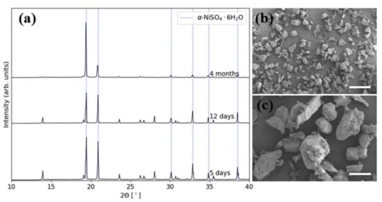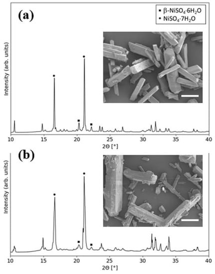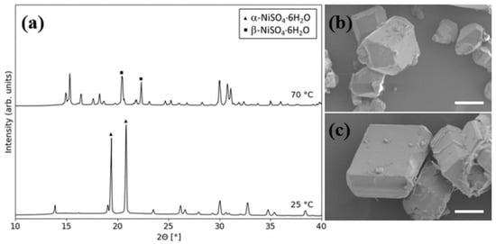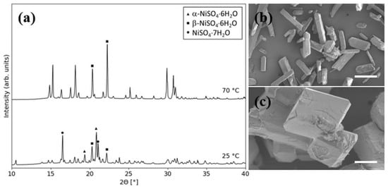 Crystallization from solutions at 25 °C and seeded with 0.2 g of α-NiSO4·6H2O, resulted in a mixture consisting of α-NiSO4·6H2O (α-NSH6), β-NiSO4·6H2O (β-NSH6) and NiSO4·7H2O (NSH7), while at 70 °C only β-NSH6 was produced, as observed from XRD analyses (Figure 5a). SEM images showed a distinct difference in crystal shape of the two products, in good accordance with the phases observed from the XRD analyses (Figure 5b,c).