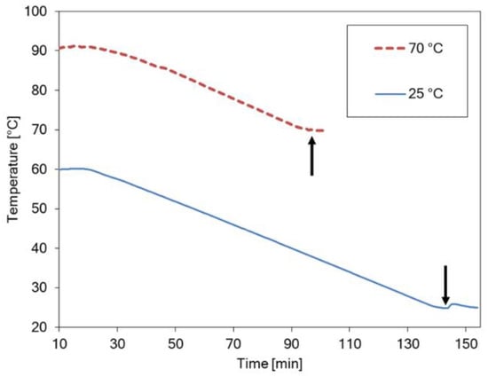 Temperature evolution during crystallization of nickel sulfate at temperatures 25 and 70 °C. Seeds were added once the desired temperature was reached, where the arrows represent the seeding time points. The cooling rate for both cases is 0.29 °C min−1. Note the temperature increase in the blue curve, showing the nucleation of nickel sulfate after seed addition.