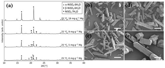 (a) XRD spectra of nickel sulfate phases precipitated with 0.2 g α-NSH6 seeds at 25 °C in the absence and presence of Mg at indicated concentration levels. SEM images of crystals collected from corresponding experiments; (b) no magnesium, (c) 5 mg g−1 Mg, (d) 9 mg g−1 Mg, and (e) 18 mg g−1 Mg. Scale bar: 100 µm.