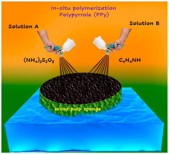 The semiconductive polypyrrole coatings were deposited over a wood sponge in order to enhance the absorption coefficient and diffuse reflection by employing a facile single-step in situ polymerization process. For this, 5 mL isopropanol was taken into a 200 mL beaker and followed by the addition of 0.85 mL pyrrole, and dissolved thoroughly. Subsequently, 1.85 mL phytic acid (50%, wt% in water) was added into the prepared solution and stirred until the formation of a dark brownish color solution, which indicates the completion of the reaction. The prepared product was labeled as solution A. The 5 mL distilled water was taken followed by the addition of 2.75 g ammonium persulfate and stirred using a magnetic stirrer until a homogeneous solution formed. This solution was labeled as solution B. Both prepared solutions were transferred into commercial spraying bottles. The wood sponge substrate was crafted into a circular shape with the following dimensions: 3 cm diameter and 3 cm thickness. The as-prepared A and B solutions were sprayed by the B-A-B-A sequential order, as illustrated in Figure 1. The successive repetitions of the spraying order were followed until the formation of intensified pitch darkness, and homogeneous deposition of polypyrrole was achieved on the top surface of the circular-shaped wood sponge. The comparative mass change was calculated before and after the deposition of polypyrrole coatings on a device to estimate the deposited mass of polypyrrole, which came out to be ~28 mg. The detailed material characterization information has been provided in Supplementary Materials Note S1.