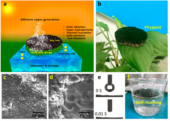 The preparation of the PPy@WS solar evaporator involves a facile, single-step polymerization of the top surface of the wood sponge. The upper surface turns pitch dark upon the application of the polymerization process, with an enhanced solar absorption capacity due to the delocalization of electrons in a conjugated system of semi-conductive polypyrrole coating [12,27]. The biodegradable wood sponge with a 3D porous network can efficiently float over the water surface while the vertically interconnected water chancels facilitate continuous water supply up to the photothermal layer and is insulated from downward thermal conduction. The incident light stimulates delocalized π-orbital electrons that absorb light and generate heat, which in turn evaporates water molecules approaching the air-water interface [15]. The lower intrinsic thermal conductivity (0.2753 ± 0.001 W·m−1·K−1) of the PPy@WS sponge restricts heat localization only on the upper matrix, thus enabling highly effective steam generation, as illustrated in Figure S1 (SI). Moreover, the microporous network of wood sponge substrate can potentially redissolve salt and other impurities back into water due to self-regenerating capacity and, thus, sustain long-term stability without structural rupturing and surface fouling. Moreover, the hierarchical vertically aligned pores with low material packing density impart the wood sponge with ultra-lightweight and flexible properties. Figure 2b represents the digital photograph of the PPy@WS standing on a plant leaf without deforming the leaf, which can ensure its portability and excellent floatability. The surface morphology and microstructural investigation of simple wood sponge and PPy@WS were analyzed by Field Emission Scanning Electron Microscopy (FESEM, JSM7100F, Shimadu, Kyoto, Japan). Figure 2c demonstrates a FESEM image of direct channels with a hierarchical vertical alignment forming open porous assembly on both ends to withstand a good potential for flexibility and efficient water pumping. The surface texture of the wood sponge is rough, which plays a key role in the diffusion of light when incident on the surface [20]. The cross-linked porous network of wood sponge along with rough surface morphology facilitates quick water pumping via capillary force up to the photothermal layer and quick vapor escape during the steam generation process. Figure 2d shows the surface morphology of the pitch dark in situ polymerized PPy@WS solar steam generator, revealing an enhanced roughness with an inset of complex structure coated over the cross-linked porous structure of the wood sponge. The intense polymerization of the top surface facilitates omnidirectional absorption by inducing multiple rays within the photothermal layer, enabling a high absorption coefficient and efficient solar steam generation. On the other hand, the lower matrix is prohibited for downward thermal passage due to the bad thermal conductivity of the wood sponge, thus restricting the immense heat localization up to the top surface. The observed surface morphology and microstructural investigation suggest the excellent potential of the PPy@WS device for excellent heat accumulation, self-floating capability, thermal insulation of lower matrix, and super-hydrophilicity of the device for quick water transport. Furthermore, the hydrophilicity of the as-prepared PPy@WS solar steam generator was investigated by the contact angle test, as shown in Figure 2e. The water droplet interacts with the PPy@WS surface and is absorbed quickly by the hierarchical porous assembly of the device within a short interval of 0.01 s. The observed wettability suggests the zero-contact angle of a water droplet and PPy@WS surface and affirms the sustainability of super hydrophilicity of the wood sponge after the polymerization process. The vertical channels impart excellent water transport relative to the device as well as outstanding self-floating potential over the water surface. Figure 2f represents the digital photograph of the PPy@WS solar steam generator floating over the surface of the water. The lower mass density and abundant end-to-end porous assembly provide exceptional floating capabilities to the PPy@WS solar steam generator along with facile water transport.