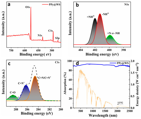 Chemical states of in situ polymerized PPy NPs at the top surface of wood pulp sponge. (a) XPS survey of PPy@WS solar evaporator. (b) N1s spectra and (c) C1s spectra of PPy@WS solar evaporator. (d) UV-Vis’s spectra of in situ polymerized PPy@WS solar evaporator over broadband range (250–2500 nm).