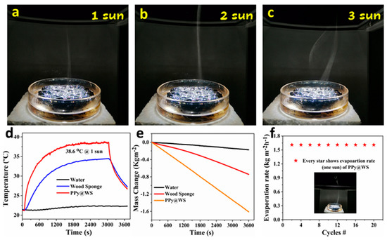 The PPy@WS manifests highly efficient steam generation due to the enhanced absorbing potential of solar energy, which can be featured due to its rough surface texture highly enhanced by in situ polymerization. The incident radiations suffer multiple diffuse reflections and scattering, which is critical for heat localization over the photothermal layer; thus, highly efficient solar steam generation is achieved [28,29,30,31]. Figure 4a–c shows the digital photograph of steam generation from PPy@WS solar steam generator when exposed under the simulated solar irradiance up to 3 kW·m−2. As observed from the figures, an enhanced solar steam generation rate is achieved upon increasing solar irradiation energy. The increased solar intensity increases the temperature of PPy@WS due to local heat generation by photothermal conversion, which increases steam generation, and ultimately an enhanced evaporation rate was achieved. In order to investigate enhanced solar energy absorption and elevated surface temperatures, we performed a comparative analysis of three systems for maximum surface temperature attainment under one sun illumination (1 kW·m−2), which includes water, wood sponge, and PPy@WS solar steam generator, as shown in Figure 4d. Upon exposure to one sun illumination for 50 min, the maximum surface temperature of the self-floating PPy@WS solar steam generator was enhanced from 22.5 °C to a steady-state temperature of 38.6 °C. The temperature attained by bulk water was 22 °C, which is much lower compared to PPy@WS. The wood sponge comparatively achieved higher surface temperatures (33 °C) than compared to bulk water but was significantly lower than the PPy@WS solar evaporator. This remarkable interfacial heat localization of PPy@WS proved its potential as a promising solar steam generator device as well as for heat accumulation applications. The surface temperature enhancement of the PPy@WS solar evaporator was also examined under solar intensities up to 3 kW·m−2, as illustrated in Figure S2 (SI).