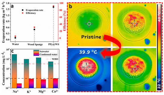 The excellent solar-thermal conversion ability of the PPy@WS solar steam generator induced higher mass change rates, which achieved enhanced efficiency. Figure 5a represents the comparative analysis of three evaporation-designed evaporation systems, which shows a significantly higher evaporation rate (1.62 kg·m−2·h−1) and solar-to-vapor conversion efficiency (93%), excluding heat losses, i.e., conduction (3.9%), convection (1.78%), and radiative (1.32%) heat losses using Equations (3)–(5). The heat localization and thermal management of any steam-generating device play a pivotal role in enhancing the efficiency of the system [7,32]. Thermal management and heat localization over a photothermal layer of PPy@WS solar steam generator were recorded via an I.R. camera under one solar irradiation, as demonstrated in Figure 5b. As obviously observed from the images, the temperatures increase gradually over time and achieved a maximum of ~40 °C temperature within 25 min, while perfectly insulating the lower matrix from thermal conduction. Thus, the lower thermal conductivity of the wood sponge restrains the temperature on the interfacial surface preventing thermal conduction towards the bulk mass of water, thus imparting unique efficiency to the reported solar steam generation device. Moreover, PPy@WS possesses outstanding salt-resistance potential against salt and primary metal ion due to its vertically aligned microporous assembly of super hydrophilic wood sponge and affirms a purity standard of condensed water up to drinking water levels. As the cross-linked water transport channels allow water evaporation only through molecular mode, this phenomenon facilitates the purification of water by removing dissolved primary metal ions such as Na+, K+, Ca2+, and Mg2+ and other contaminations. In order to check this, Inductively Coupled Plasma Atomic Emission Spectroscopy (ICP-AES. Perkin Elmer, San Jose, CA, USA)) was employed to check the concentration gradient of soluble salt ions (3.5 wt% NaCl, KCl, MgSO4, and CaCl2), and the desalination potential of the PPy@WS solar steam generator was calculated by using simulated and condensed water. The results achieved from the ICP-AES are shown in Figure 5c, exhibiting a significantly lower concentration of Na+, K+, Ca2+, and Mg2+ in the condensed water compared to the initial concentration in the simulated water. It is far below the standard of drinking water set by the World Health Organization; thus, the application of PPy@WS solar evaporator is up to the standards of drinking water.