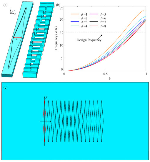 Figure 1a. Although the unit cells along the wave propagation direction are still discretely arranged, the generally-discrete unit cells are continuous merged along the transversion direction. The leaf-like profile allows the central groove of each unit cell to be wider than those at the two ends, which reduces the wave velocities of the Lamb waves.