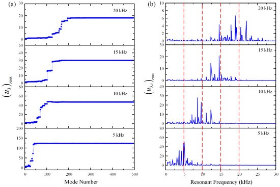 i-th mode to the transient displacement. By observing Equation (3) we can see that only the second term is dependent of time. The other terms, such as resonant frequencies and mode shapes, are all vibration characteristics of the PCLs plate which are independent of the observation time, magnitude of the external loadings, and excitation locations. Thus, if one can obtain resonant frequencies and mode shapes of the finite periodic structures (here the PCLs) in advance, the transient solution in Equation (3) could be used to estimate the full-field transient wave propagation corresponding to various forms of loadings and at any time. Although the unit cell configuration of the PCLs is complex, finite element analysis is an effective method to extract the vibration characteristics of PCLs plate with various boundary conditions before being substituted into transient solution to obtain the full-field transient wave field.