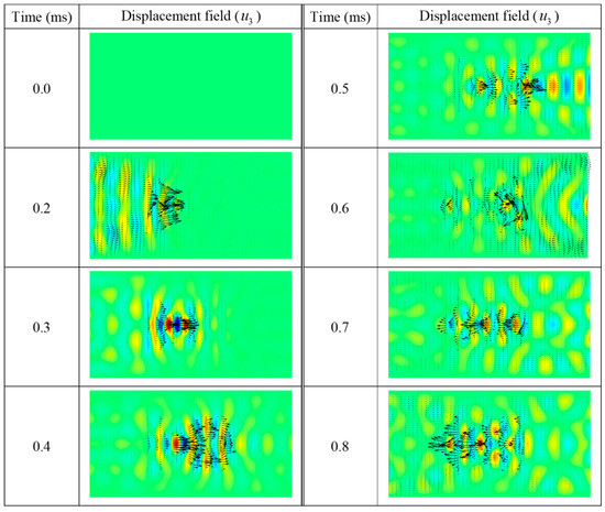 Figure 5. Full-field transient wave propagations (here the displacement field) in practical finite periodic structures at successive time are essentially constructed by the vibration mode shapes at the corresponding time, where the contribution of each modes is determined by the corresponding weighting coefficient (i.e.,